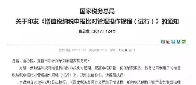 为了进一步加强和规范增值税纳税申报比对管理,提高申报质量,优化纳税服务,税务总局就制定了《增值税纳税申报比对管理操作规程(试行)》,将于2018年3月1日起在各省市国税局开始施行。